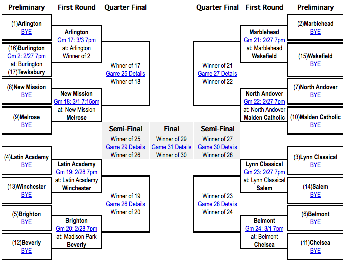 Parello's Pick: Call me crazy, but I think this bracket lines up really nicely for Belmont to make a deep run. The Marauders won't have a game off, but also have the talent to play with Lynn Classical or Salem in the quarterfinals, and can certainly shoot their way to an upset of Marblehead, should they see the Magicians in the semis. The other side of the bracket is brutal, though, and I think whichever team survives that potential Arlington-New Mission quarterfinal probably becomes the favorite. They've been a great story all year, so give me the Spy Ponders, but man this bracket is loaded.
